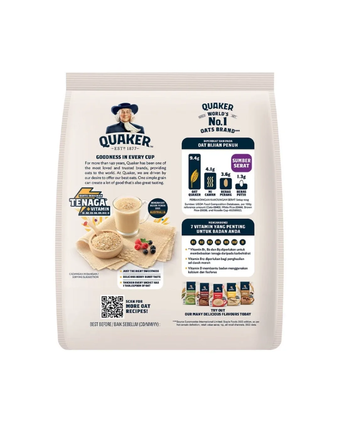 The Quaker Oat Cereal Drink 3-in-1 Berry Burst is a convenient breakfast or snack option. It typically comes in a pack containing 15 sachets, with each sachet weighing 30 grams. This product is designed to be a quick and easy way to enjoy the benefits of oats combined with a fruity berry flavor.