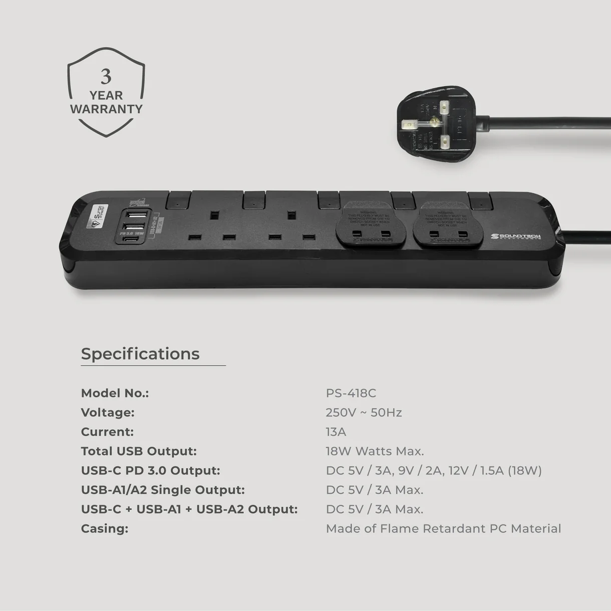 Soundtech Electronic 4Way 3M USB A+C Quick Charger Power Strip With Surge Protection – PS-418C